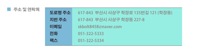 상호 : 선경볼트공업 주소 : 부산시 사상구 학장로 135번길 121 (학장동) Tel : 051-322-5333 Fax : 051-322-5334